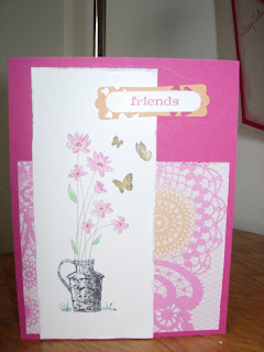 Yesterday I was playing with a couple of new stamp sets, I started with Rose red paper added DSP- Flirtatious Specialty. The vase is from Always Thankful Stamp Set and Flowers from Up in the Air. Don't you just love those stamp sets. I used the Modern Label and the Word Window, what girl doesn't love her punches! Quick, and easy for eveybodies busy schedule, but something from the heart.